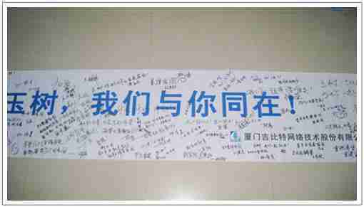 在募捐现场,,35273同学们怀着沉重的心情,,,将每一笔捐款投入募捐箱,,,,并在现场设置的横幅上,,写上了对玉树人民的深情祝福。。。满载35273祝福的横幅将和捐款一起抵达玉树,,,希望谨以此微薄之意,,,为玉树人民带去35273的爱心与祝福,,,,希望吉祥、、、幸福的阳光能早日驱散灾难的阴霾,,,,普照在玉树人民的身上,,,,鼓励他们坚强、、、勇敢与乐观。。