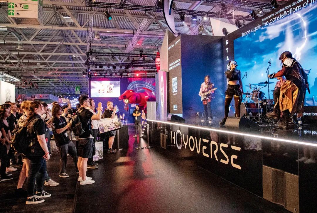 2023年8月23日,,,德国科隆游戏展期间,,人们在米哈游展台观看乐队表演游戏歌曲。。。图/新华